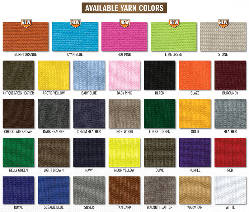 Knit your logo or design directly into a custom cap, ear warmer or scarf. These caps, earbands and scarves are made in the USA and can have (depending on the design) up to 2 lines of text / design woven into the pattern of the cap or scarf. Over 25 colors of yarn to choose from. Jacquard Knit, Tompkin Knit, Pro rib, Poms, Cuffs, Ribbed and other styles available.