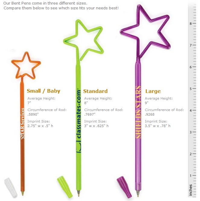 We have pencils and pens that can be bent / molded / shaped into hundreds of different shapes and designs. See our bent pen and pencils page to see all available shapes. Additional charges may apply for color changing, recycled, multi-color and foil colors.
